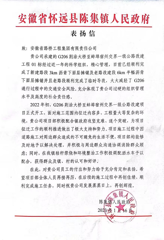 近日,蚌埠市懷遠縣陳集鎮人民政府向安徽路橋集團發來表揚信,對G206荊涂大橋至蚌埠宿州交界一級公路改建工程01標項目團隊的辛苦付出和所作努力給予充分肯定和表揚。