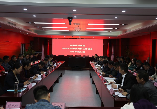 11月5日下午,安徽路橋集團在安建大廈8樓會議室召開2018年四季度黨群工作例會。公司黨委書記、董事長盛明宏,公司黨委委員、工會主席王永來出席會議,公司黨委委員、紀委書記王勝利主持會議。所屬各基層黨總支、支部、工會、團組織主要負責同志及公司機關黨群部門負責人參加會議。