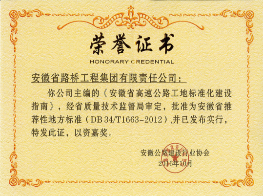 在系列指南編寫中,公司承擔了《安徽省高速公路工地標準化建設指南》(DB 34/T 1663-2012)的主編和《安徽省高速公路施工標準化指南 第5部分:隧道工程》(DB 34/T 2558-2015)的參編工作,其中主編的《安徽省高速公路工地標準化建設指南》及主要編寫人員獲得表彰。