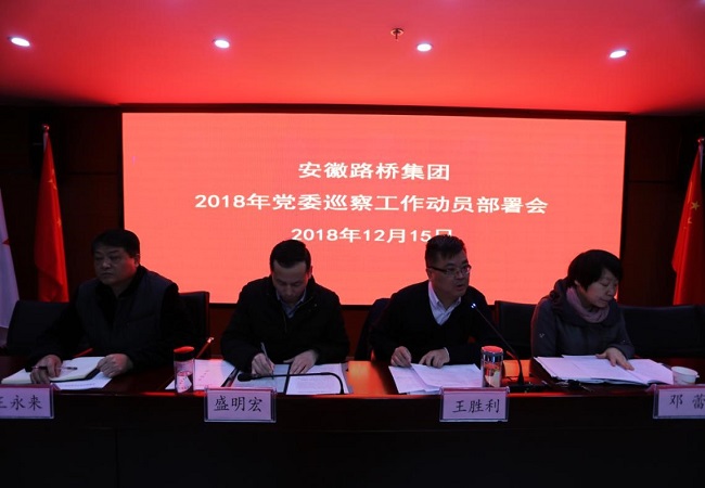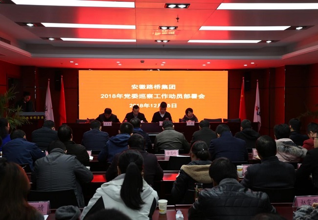 為貫徹落實全面從嚴治黨主體責任和監督責任,規范路橋集團巡察工作,促進公司健康發展,12月15日,安徽路橋集團召開2018-2019年黨委巡察工作動員部署會。黨委書記、董事長盛明宏出席會議并作動員部署講話,黨委委員、紀委書記王勝利主持會議,公司巡察領導小組成員、紀委委員,所屬各子分公司黨政負責人、紀檢委員、黨群部門負責人及公司巡察辦及巡察組人員共計60人參加會議。