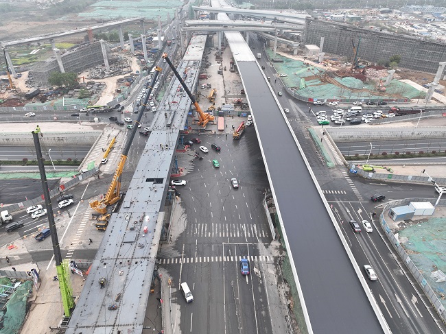 此次吊裝的Y6聯鋼箱梁設計為55米+80米+55米跨徑,總長190米,共60片梁,重約2800噸。項目自春節復工以來,統籌規劃,不斷攻堅克難,克服了地下管線復雜、供電遷改難度大、交口交通流量極大、互通立交交叉施工工序多等困難,當前,全體參建人員鉚足干勁,合力攻堅,正在有序推薦互通匝道橋梁及跨機場高速橋梁等重要節點,力爭10月1日全線通車。