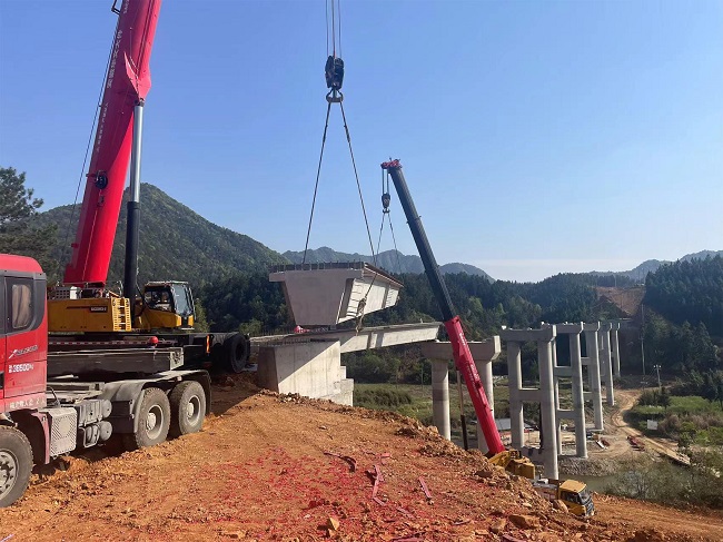 面對山區地理位置特殊、高空作業的安全風險,為確保首片預制箱梁順利架設,項目部精心策劃、科學部署,針對箱梁架設的設備安裝、人員組織、施工安全、質量管理等生產要素制定了詳細的專項方案和應急預案。在箱梁運輸過程中,項目部組織運梁班組查看運輸路線,全程跟蹤疏導交通,尤其是在山區轉彎、坡路等路段增派人員,加強指揮檢查。施工現場,技術人員對作業人員進行了詳細的技術交底與安全交底,為加強施工現場過程控制,管理人員對吊機、起重機、運梁車等進行反復檢測、操作、試運行,按照架設操作規程操作,統一安排,相互配合,圓滿完成了首片箱梁架設任務。
