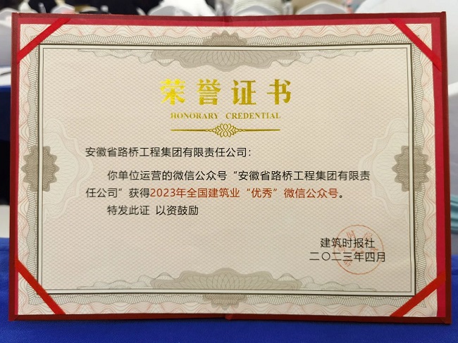 4月20日,2023年建筑業(yè)微信公眾號運(yùn)維經(jīng)驗交流研討會暨全國建筑業(yè)優(yōu)秀公眾號頒獎典禮在廣西省南寧市召開。連續(xù)四年,公司微信公眾號“安徽省路橋工程集團(tuán)有限責(zé)任公司”(微信號:ahlqjt)再獲“全國建筑業(yè)優(yōu)秀微信公眾號”榮譽(yù)稱號。