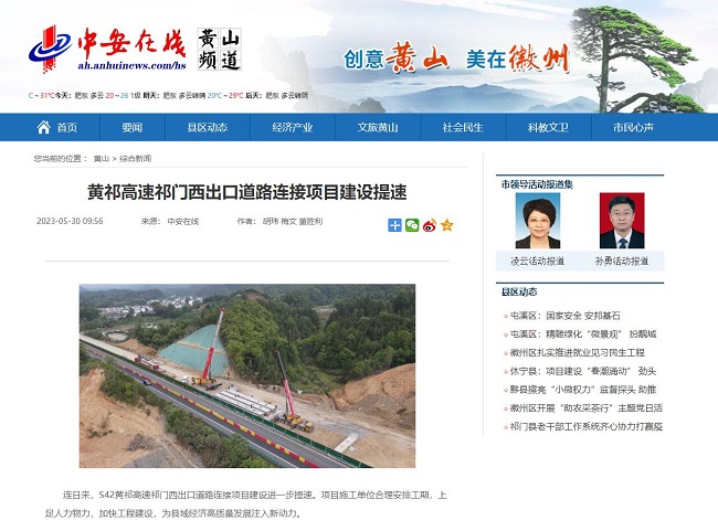 5月30日,中安在線黃山頻道對S42黃祁高速祁門西出口道路連接項目合理安排工期,上足人力物力,加快工程建設展開報道。