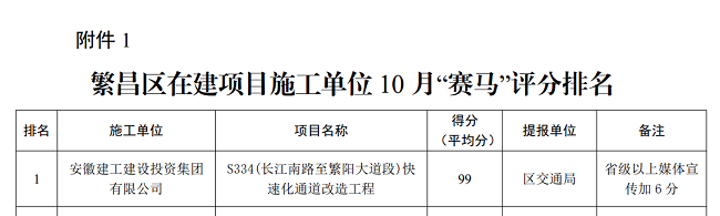 近日,由繁昌區人民城市建設辦公室組織的繁昌區在建項目施工單位月度“賽馬”評分考核活動中,建工建投集團S334長江南路至繁陽大道段快速化通道改造工程02標項目從參賽的67個施工單位中脫穎而出,以總分排名第一的優異成績獲評“天馬獎”!