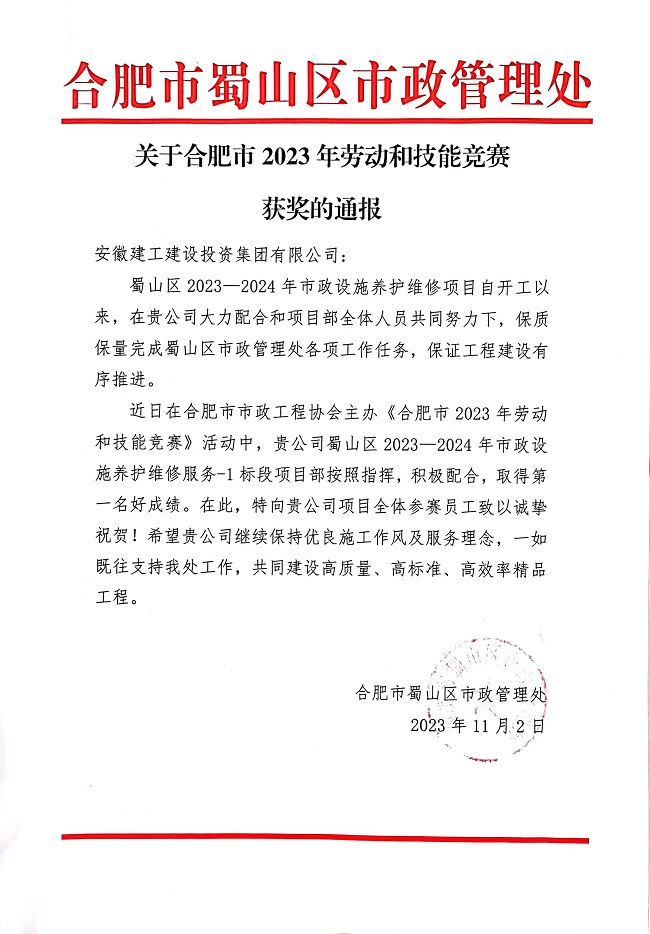 近日,建工建投集團蜀山區2023—2024年市政設施養護維修服務-1標段項目在合肥市市政工程協會主辦《合肥市2023年勞動和技能競賽》活動中表現優異,協助業主取得了第一名的好成績,獲合肥市蜀山區市政管理處通報表揚。