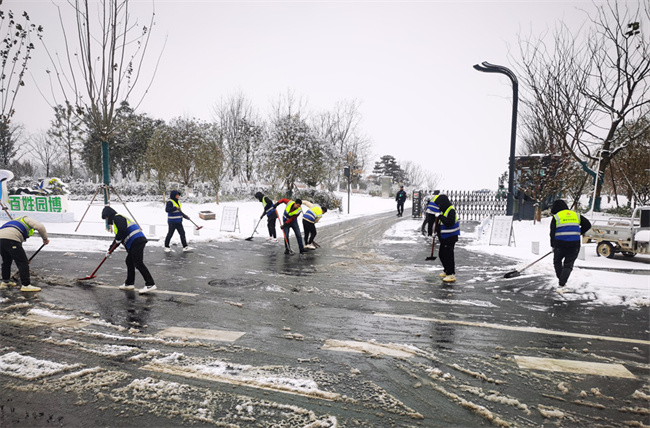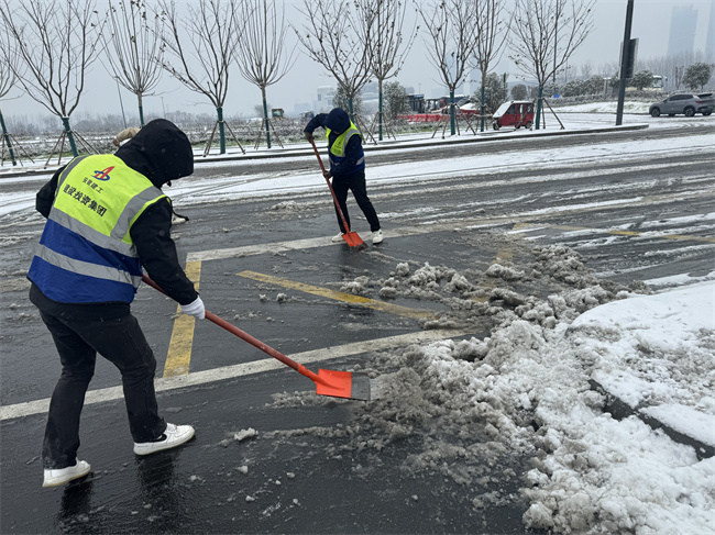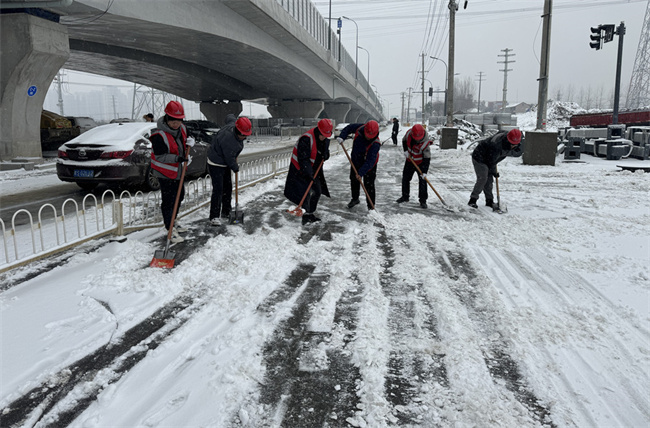 ▲青海路項(xiàng)目由項(xiàng)目經(jīng)理帶隊(duì),發(fā)動(dòng)項(xiàng)目班子及普通員工共17人,使用鐵鍬、掃把、融雪鹽,為青海路撒鹽鏟雪,有效保障了行車(chē)安全,為園博園入園觀賞的游客提供安全保障。