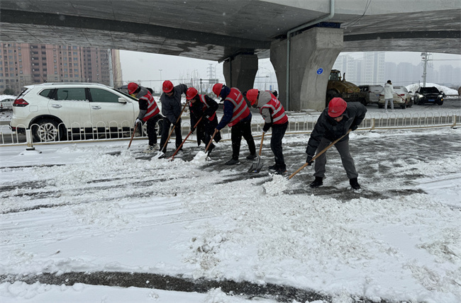 ▲潛山路項(xiàng)目集結(jié)23名管理人員,使用鐵鍬、掃把、融雪劑,輔助2臺(tái)鏟車(chē)、1臺(tái)平板車(chē)進(jìn)行除雪工作,保證潛山路沿線安全通行。