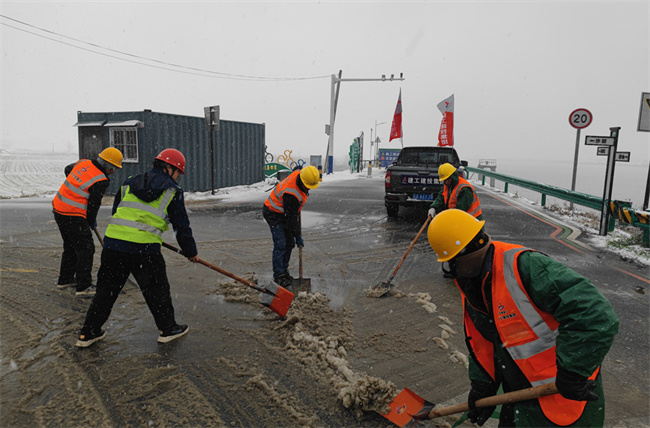 項(xiàng)目員工不畏嚴(yán)寒,團(tuán)結(jié)協(xié)作,揮舞著鐵鍬和掃帚對(duì)路面積雪進(jìn)行清掃,對(duì)施工大轉(zhuǎn)盤(pán)、脊嶺頭、道路主干道、上下坡等重點(diǎn)部位撒布工業(yè)鹽。截至18日中午,共出動(dòng)車(chē)輛4部,人員30余人,撒布工業(yè)鹽30余袋。