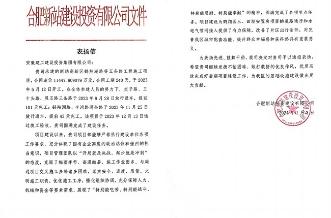 近日,建工建投集團(tuán)收到合肥新站投資建設(shè)有限公司發(fā)來的表揚(yáng)信。信中對建工建投集團(tuán)及鶴翔湖路等五條路工程施工項(xiàng)目管理團(tuán)隊提前43天圓滿完成施工任務(wù)予以充分肯定和表揚(yáng)。
