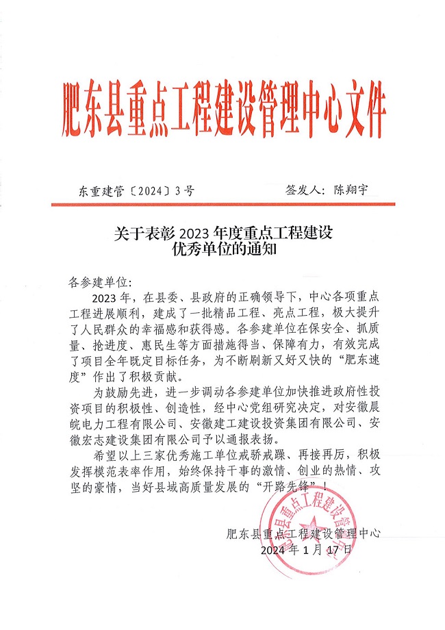 表揚信中指出,建工建投集團(tuán)在保安全、抓質(zhì)量、搶進(jìn)度、惠民生等方面措施得當(dāng)、保障有力,有效完成了項目全年既定目標(biāo)任務(wù),為不斷刷新又好又快的“肥東速度”作出了積極貢獻(xiàn)。