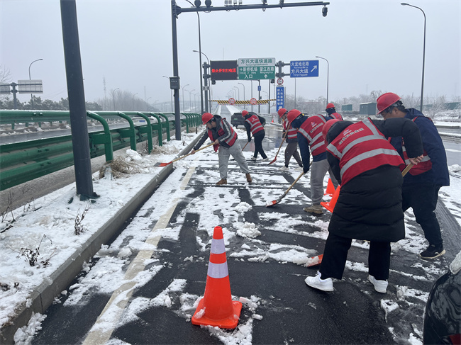 G312合六路(南崗鎮-侯店路)項目部迅速響應,組織工程部、安全部、物資部等10名人員,攜帶鐵鍬等除雪工具,趕赴方興大道快速路新橋機場入口處,展開了一場緊張而有序的除雪保暢工作。