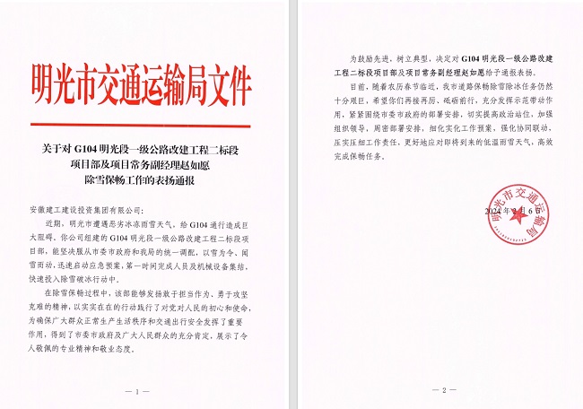 2月6日,G104明光段一級公路改建工程二標段項目部收到明光市交通運輸局發來的表揚信,信中對項目部在這次除雪保暢的工作予以充分肯定和表揚。