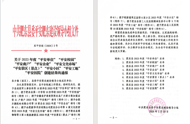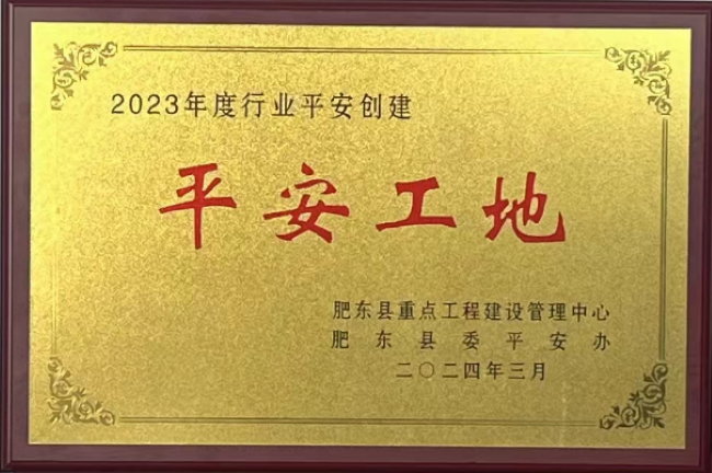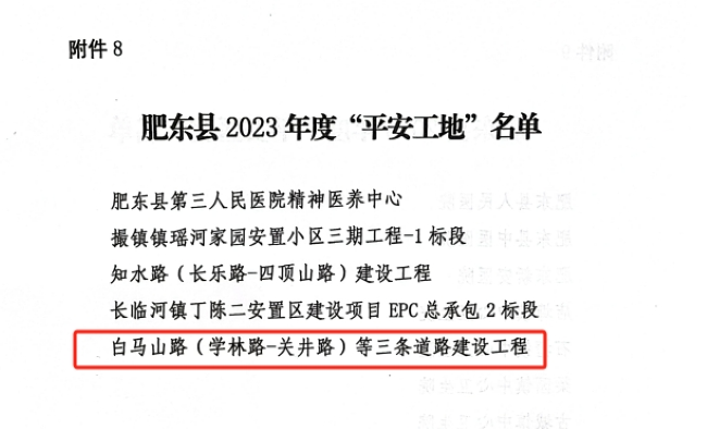 近日,建工建投集團承建的白馬山路(學林路-關井路)等三條道路建設工程項目榮獲肥東縣2023年度“平安工地”稱號,項目安全管理得到屬地政府高度認可。