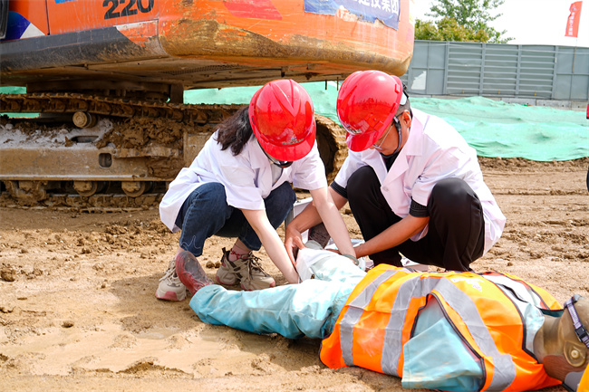 機(jī)械傷害事故應(yīng)急救援演練模擬作業(yè)人員橫穿施工區(qū)與挖機(jī)發(fā)生剮蹭的機(jī)械傷害事故。現(xiàn)場(chǎng)管理人員發(fā)現(xiàn)后,第一時(shí)間向應(yīng)急領(lǐng)導(dǎo)小組總指揮長(zhǎng)報(bào)告險(xiǎn)情,立即啟動(dòng)應(yīng)急救援預(yù)案,迅速進(jìn)入應(yīng)急狀態(tài),6個(gè)救援小組科學(xué)有序開(kāi)展救援,事故現(xiàn)場(chǎng)得到有效控制,傷者成功獲救并被及時(shí)送往醫(yī)院治療,救援任務(wù)圓滿(mǎn)完成,應(yīng)急響應(yīng)宣布終止。