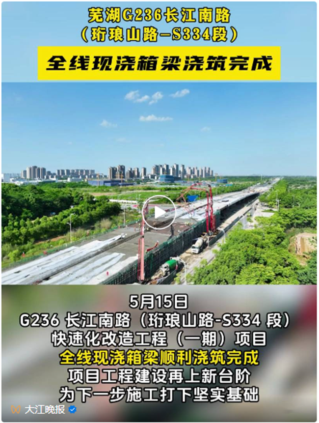 5月15日,正在施工的G236 長江南路(珩瑯山路-S334段)快速化改造工程(一期)項目傳來好消息,全線現澆箱梁順利澆筑完成,項目工程建設再上新臺階,為下一步施工打下堅實基礎。