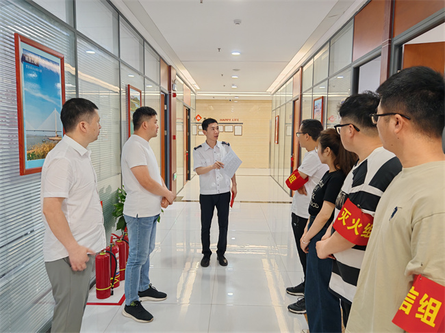 交底結束后,所有人員返回各自工作崗位,隨著警報聲響起,疏散組第一時間到位,在引導所有人員利用手邊毛巾、口罩等物品輕捂口鼻,躬身快速從設定起火點的另一側樓梯撤離至一樓廣場安全地帶后,及時對現場進行警戒和封控,信息聯絡組人員緊急開展對外聯絡和清點人數工作,應急救援組配合人數清點,并及時開展傷員的前期處置和心理疏導,滅火組立即組織人員對模擬火點進行初起撲滅工作,整個演練過程迅速而有序。