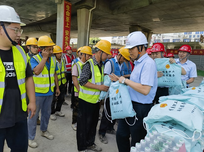張剛一行詳細了解施工進展情況及項目部防暑降溫舉措,看望并慰問高溫下仍堅守崗位的一線工人,同工人們進行親切交流,送上了人丹、十滴水、洗漱用品及礦泉水等防暑降溫物資,感謝他們?yōu)楹戏蚀蠼ㄔO作出的貢獻,并叮囑工人們要注意自我防護和安全生產(chǎn),做好防暑降溫,做到勞逸結(jié)合,適當休息,以健康、飽滿的狀態(tài)投入到生產(chǎn)中。