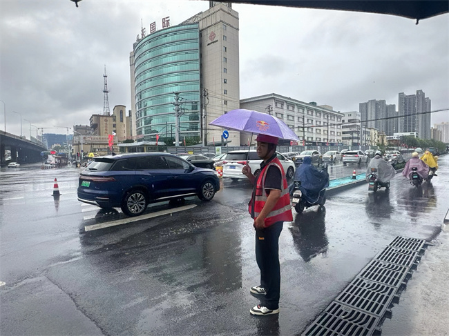 在合肥又雙叒叕開啟暴雨狀態下,金寨路高架橋綁寬項目全體員工聞“汛”而動,樹立“雨不停、人不走”的原則,嚴格落實24小時值班制度,密切關注高架橋上雨情、水情變化,及時打開雨水箅助排,組織人員提前對非機動車道積水區域設置錐桶臨時封閉。