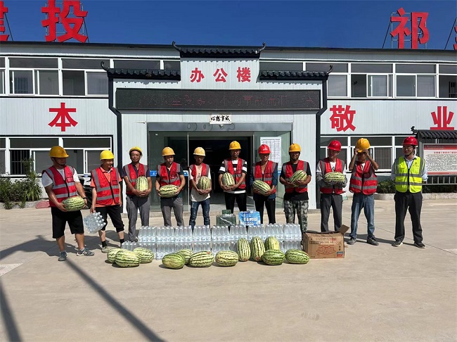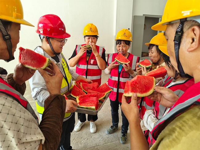 為了確保建筑工人的身體健康和施工安全,項目部高度重視防暑降溫工作,提前制定了詳細的防暑降溫方案。項目部實行“抓兩頭、歇中間”的作息制度,讓工人們能夠在相對涼爽的時間段進行作業。在施工現場,項目部設置了多個防暑降溫休息點,配備了充足的飲用水、綠豆湯、西瓜、藿香正氣水等消暑“神器”,保障一線建設者度過高溫天氣。
