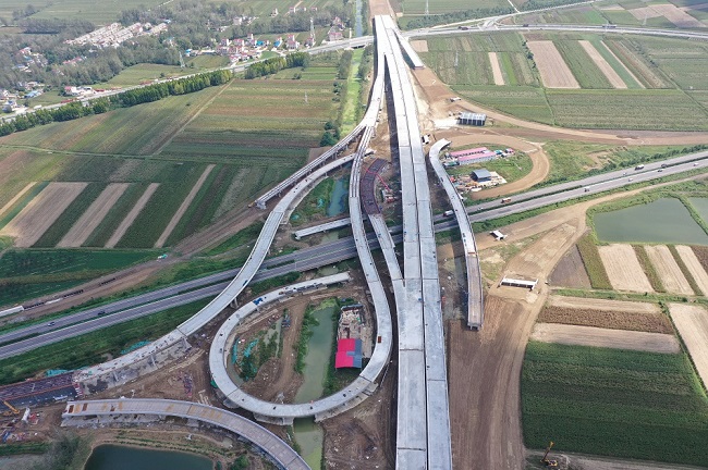 五蒙高速包集樞紐位于蚌埠市懷遠縣包集鎮,設計通過包集樞紐與京臺高速之間實現交通轉換。作為本標段的控制性工程,包集樞紐支架現澆箱梁工程量大,現澆梁共計23聯,設計澆筑混凝土方量19503m3,其中4聯現澆梁橫跨北清溝河,6聯現澆梁位于溝塘內。樞紐施工現場環境復雜,施工難度大、安全風險高,包含主線特大橋2座,全長1236m;匝道橋8座,全長4121m,主線橋A、B、C、D匝道橋均上跨京臺高速。