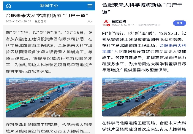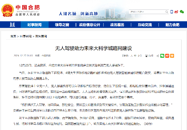 12月25日,建工建投集團合肥市科學島北路等4條道路工程項目瀝青下面層無人攤壓施工順利進行。《合肥日報》、合肥在線等媒體深入項目一線展開報道,稿件登上合肥市政府官網(wǎng)首頁。