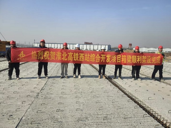 1月8日上午,淮北市高鐵西站綜合開發項目順利完成緯五路跨劉河溝橋箱梁架設。