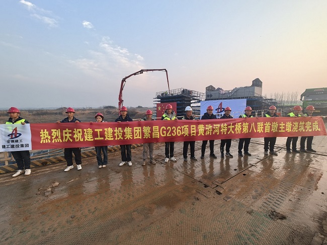 春節前夕,黃滸河特大橋施工現場依舊熱火朝天。1月22日下午,建工建投集團繁昌區G236項目二標段黃滸河特大橋關鍵性節點第八聯26#墩左幅主墩墩身順利澆筑完成,標志著第八聯懸臂澆筑正式邁入上部結構施工。