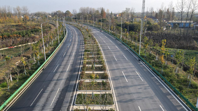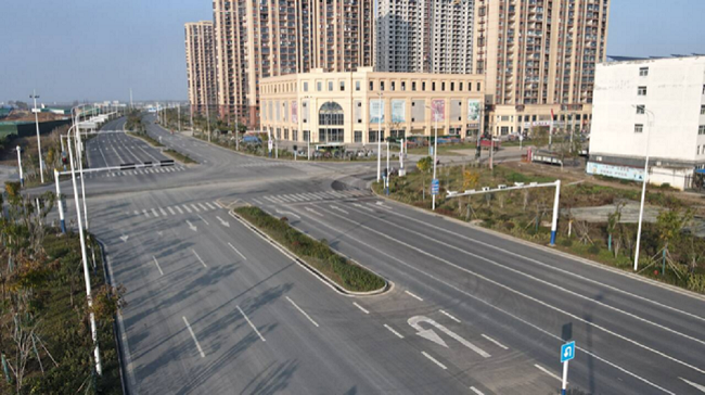 項目總體線路走向由南向北呈“L”布置,全長8.643km,路面寬23m,雙向6車道,一級公路兼顧城市主干道功能。施工范圍包含路基、路面、橋涵、綠化、照明、給排水、交通工程等內容。