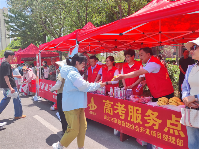 淮北市高鐵西站綜合開(kāi)發(fā)項(xiàng)目在濉溪縣第二中學(xué)外搭建起溫馨的服務(wù)站,為考生和家長(zhǎng)提供各類(lèi)貼心服務(wù),如礦泉水、防暑物品、水果等。他們以真誠(chéng)的笑容和細(xì)致的關(guān)懷,為緊張的高考氛圍增添了溫暖與力量。