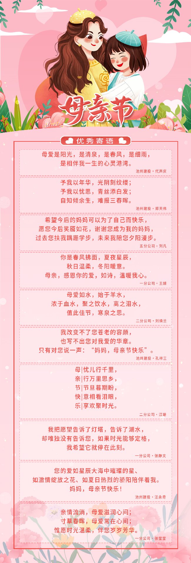 濃情五月,萱草花開。為慶祝第111個母親節的到來,弘揚偉大母愛精神,營造尊重母親、感恩母親的良好氛圍,建工建投工會組織開展溫馨寄語征集活動,向母親節獻禮。廣大職工用感恩的心、最真的情抒發對母親的愛意。本次母親節寄語共征集154條,評選出優秀寄語32條。即日起逐一呈現,讓我們來聽聽工程人對母親的愛意告白。