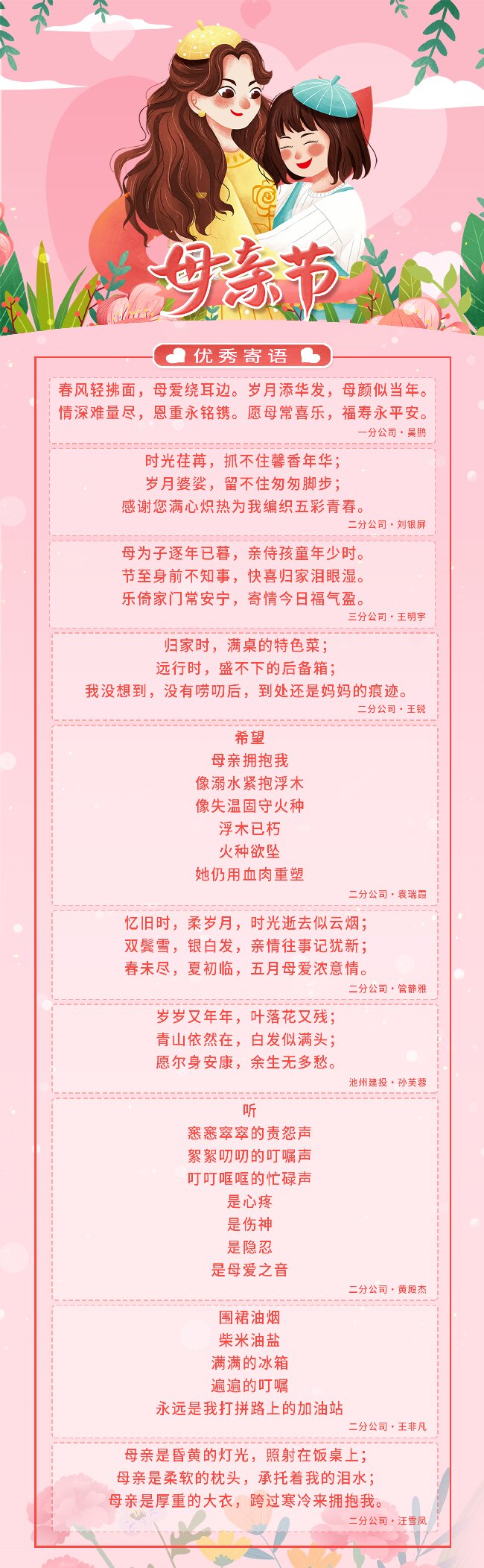 濃情五月,萱草花開。為慶祝第111個母親節的到來,弘揚偉大母愛精神,營造尊重母親、感恩母親的良好氛圍,建工建投工會組織開展溫馨寄語征集活動,向母親節獻禮。廣大職工用感恩的心、最真的情抒發對母親的愛意。本次母親節寄語共征集154條,評選出優秀寄語32條。即日起逐一呈現,讓我們來聽聽工程人對母親的愛意告白。