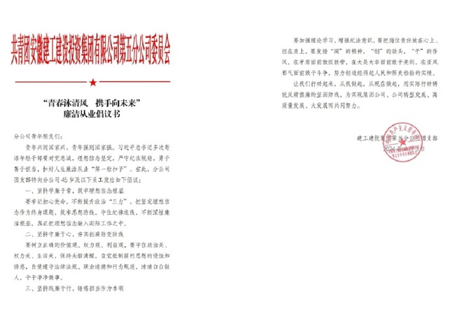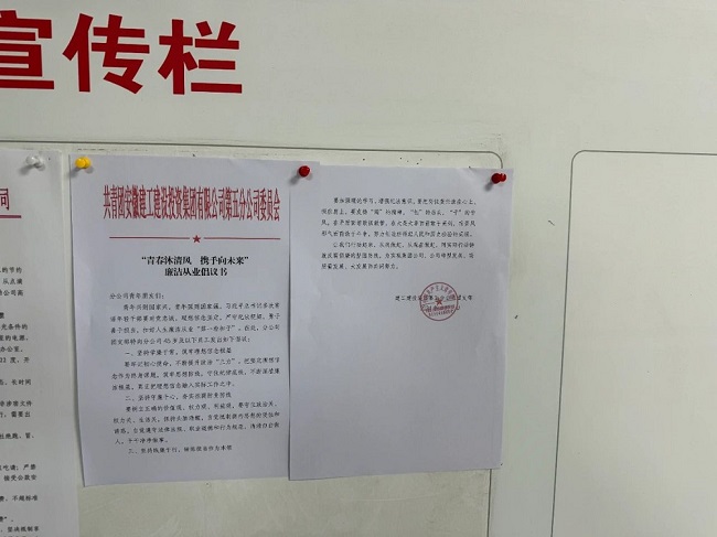為進(jìn)一步加強(qiáng)廉潔文化教育,分公司團(tuán)支部發(fā)布“青春沐清風(fēng) 攜手向未來”廉潔從業(yè)倡議書,鼓勵(lì)各項(xiàng)目立足自身,打造多形式、多渠道的廉潔文化宣傳陣地。同時(shí)劃區(qū)分片定人送廉潔文化、警示案例到項(xiàng)目部,以案促廉,促使分公司團(tuán)青受警醒、知敬畏、懂規(guī)矩、守紀(jì)律、明底線、慎言行、作表率。