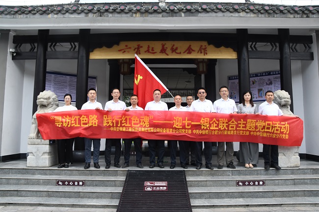 為持續(xù)推動(dòng)學(xué)習(xí)貫徹習(xí)近平新時(shí)代中國(guó)特色社會(huì)主義思想主題教育走深走實(shí),喜迎建黨102周年,6月20日,設(shè)備租賃分公司黨支部聯(lián)合中信銀行六安分行黨委及合肥蒙城路支行黨支部開(kāi)展“尋訪紅色路,踐行紅色魂”“迎七一”銀企黨建聯(lián)建共建活動(dòng)。建設(shè)投資集團(tuán)董事、財(cái)務(wù)總監(jiān)章興紅,中信銀行相關(guān)領(lǐng)導(dǎo)等參加了此次活動(dòng)。