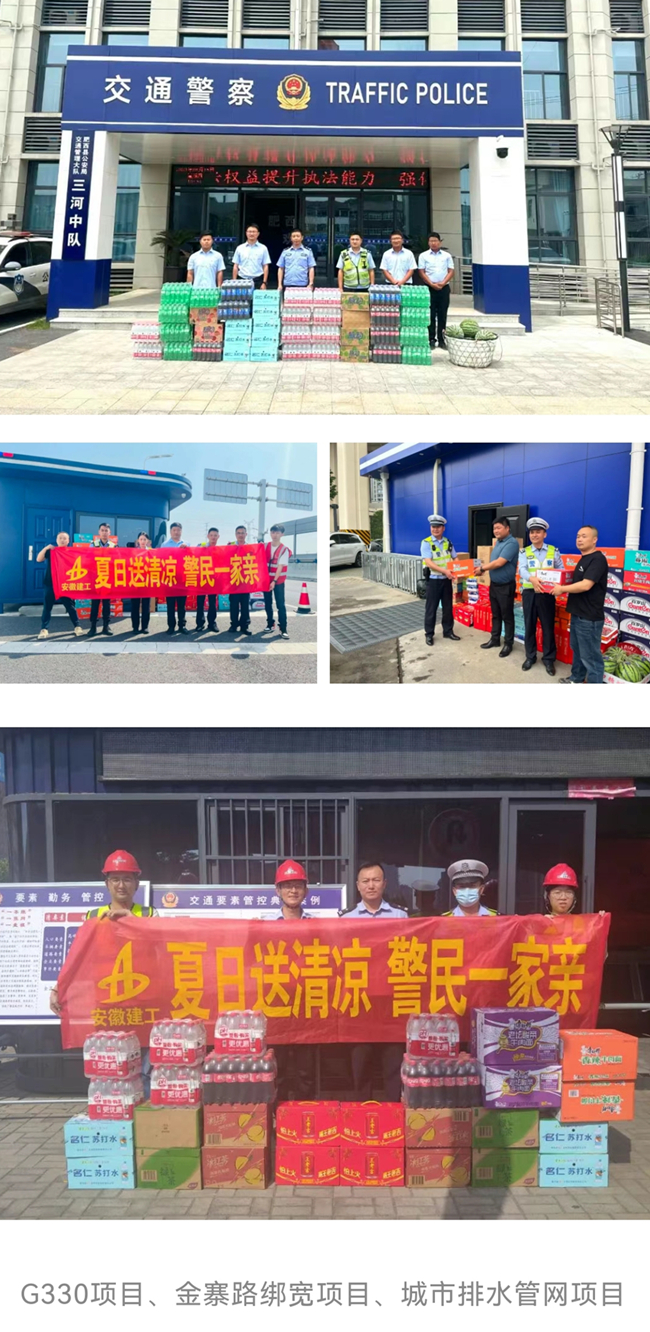 夏日高溫天氣,一線執勤交警頂烈日、戰高溫,始終保持高昂的斗志和嚴整的警姿,為人民群眾的安全出行保駕護航。安建交建公司金寨路高架綁寬項目、G330合銅公路項目、城市排水管網改造項目近日開展“夏日送清涼,警民一家親”主題活動,主動為一線執勤的交警送去礦泉水、飲料、方便面等防暑生活物資,為奮戰在高溫下的“堅守者”們送去了絲絲清涼,表達崇高敬意。