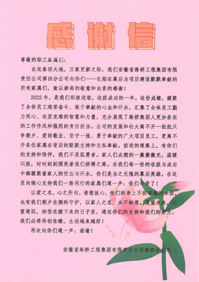 本次活動從策劃方案、選購慰問品、起草慰問信等,每一個小細節(jié)都滿載著四分公司黨政工團對員工及家屬的厚愛和感激之情。下階段,四分公司將持續(xù)聚焦項目職工所需所盼,把職工冷暖放在心里,以傳遞關(guān)懷、情暖后方的實際行動,解職工憂、暖職工心,全力做好項目職工的后方保障工作,讓項目職工切實感受到分公司的關(guān)懷和重視,踔厲奮發(fā),勇毅前行,為助力公司高質(zhì)量發(fā)展匯聚奮進力量。