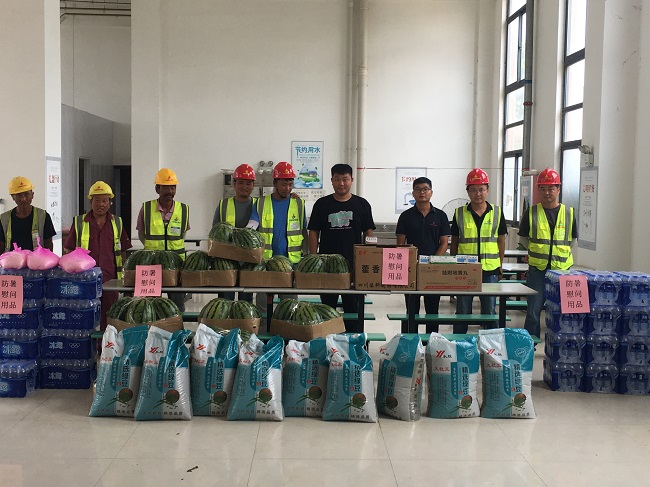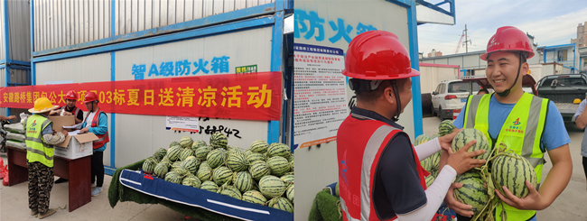 6月21日起,花園大道項目、包公大道03標項目、槐樹灣路項目分別組織安全部、綜合部等工作人員在生活駐地區(qū),將藿香正氣液、西瓜、綠豆等防暑降溫用品分發(fā)到一線建設者手中,并認真囑咐高溫環(huán)境下作業(yè)一定要注意預防中暑,做到安全生產、安全操作,感受企業(yè)在炎炎夏日送來的“清涼”和關愛。