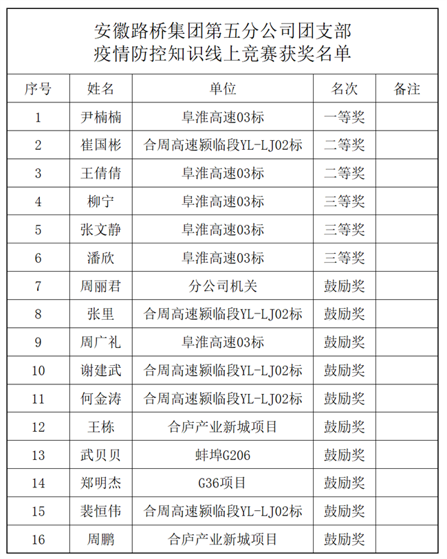 五分公司團(tuán)支部還舉辦了線上防疫知識競賽,圍繞個(gè)人防護(hù)知識、防控政策、項(xiàng)目現(xiàn)場管理、健康排查、應(yīng)急處置、宣傳教育、日常監(jiān)管等多個(gè)方面進(jìn)行,以賽促學(xué)、以賽促行,最終16名團(tuán)青取得優(yōu)異成績。在提升項(xiàng)目人員防疫知識水平,降低疫情風(fēng)險(xiǎn)的同時(shí),進(jìn)一步抓實(shí)抓細(xì)各項(xiàng)疫情防控措施,發(fā)揮“青”字號品牌優(yōu)勢。