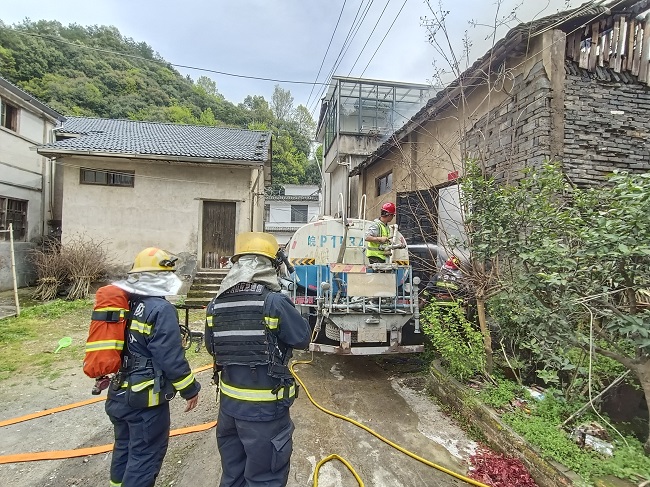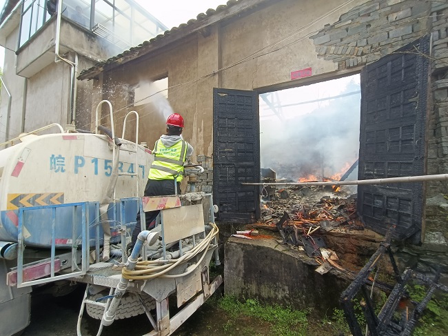 3月29日下午2點左右,黃千高速02標(biāo)項目所在的武陽鄉(xiāng)一制茶傳統(tǒng)作坊突發(fā)火災(zāi),現(xiàn)場濃煙滾滾,火勢猛烈。項目部現(xiàn)場施工人員察覺到火情后,立刻撥打119報警并向項目部反饋。對此,項目部第一時間做出緊急部署,迅速安排由安全部牽頭,組建應(yīng)急救援小隊,從施工現(xiàn)場調(diào)派灑水車第一時間奔赴現(xiàn)場參與滅火。