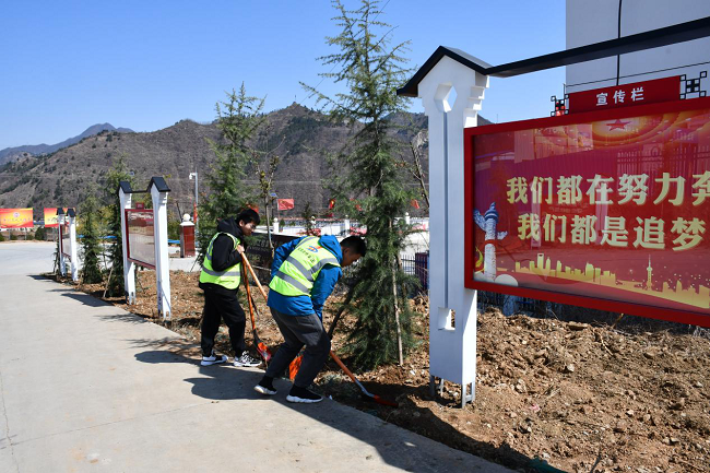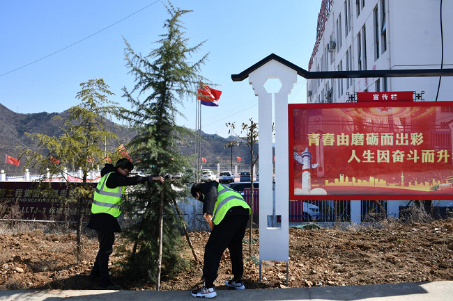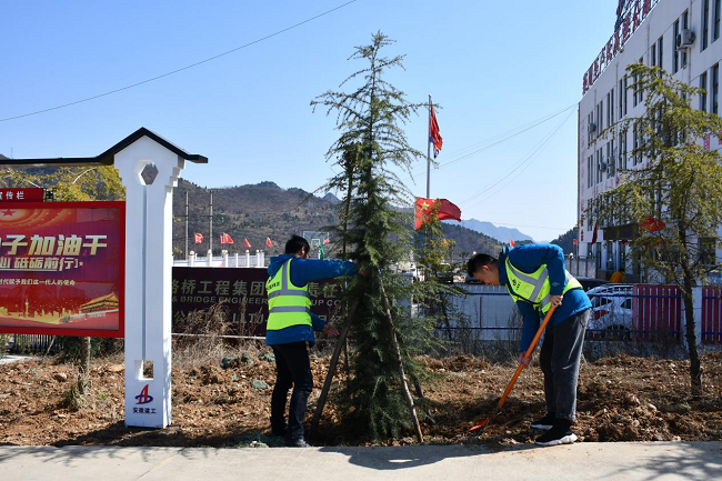 陽春布德澤,萬物生光輝。正是春風(fēng)送暖的好時節(jié),欒盧項目的員工們在項目部所在的道路兩側(cè)栽下棵棵樹苗,留下片片新綠。大家默契配合、分工協(xié)作,揮鍬鏟土、填入青松、扶直樹苗、培實新土、提水澆灌,每一道工序都一絲不茍的完成。經(jīng)過一上午的栽種,項目部主干道兩側(cè)全部種上青松。