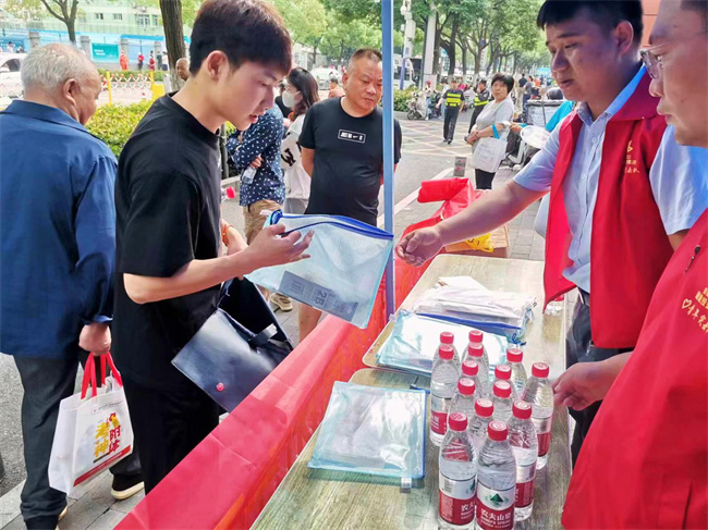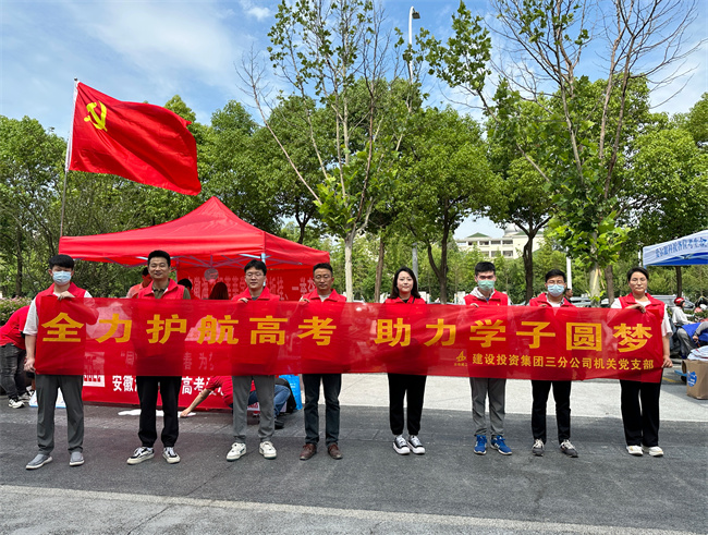 金寨路高架橋綁寬項目組織共青團員成立一支高考志愿服務隊,在考點外設置“高考服務點”,向有需要的考生和家長免費發放考試必備文具、礦泉水、防曬帽及防暑降溫等愛心物資,為考生送去一聲聲“加油”鼓勁聲,為場外等候的家長提供休息凳、涼棚和祝福。