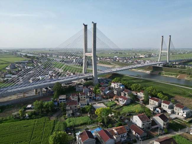 項目控制性工程楊灣河特大橋(望江大橋)全長1322米,主跨365米,由685米雙塔預(yù)應(yīng)力混凝土斜拉橋與637米東西引橋組成,主塔塔高110米,是安徽省在建同類預(yù)應(yīng)力鋼筋混凝土斜拉橋第二大跨徑橋梁,也是安徽建工集團目前承接單跨跨徑最大的橋梁工程。