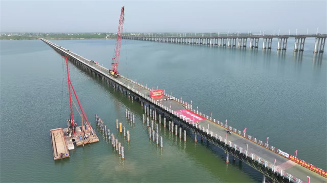 城西湖特大橋全長9117m,位于霍邱縣既有G328國道上游300m處,跨越2.5公里寬城西湖水面,整個(gè)特大橋共計(jì)75聯(lián),引橋采用跨徑組合為30m和40m先簡支后連續(xù)預(yù)應(yīng)力混凝土小箱梁,主橋采用50m+80m+50m變截面鋼箱梁。此次貫通的鋼便橋全長約2.4公里,寬6米。
