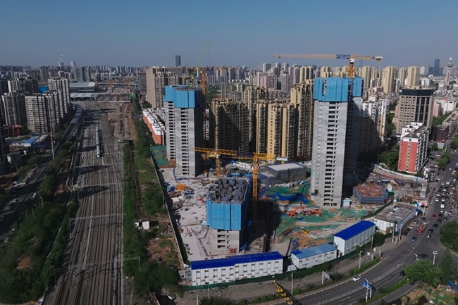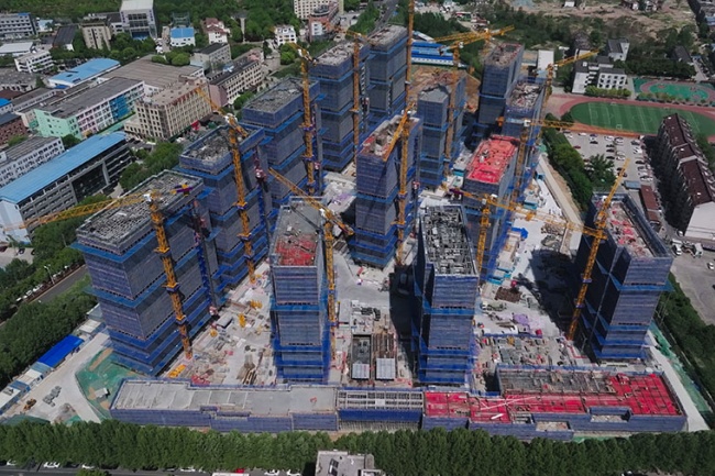 走進合肥市蜀山區SS11-G-05-02號地塊施工現場,同樣是一派熱火朝天的景象。數十臺塔吊高聳揮舞,混凝土泵車轟鳴作響,運輸車輛穿梭如織;數百名工人奮戰一線,鋼筋綁扎、模板支設與焊接作業同步推進,焊花飛濺如星。