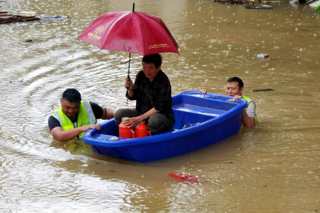 項目部全體黨員沖鋒在前,在道路損毀、無法通行的情況下,克服重重困難,自制塑料船和竹筏,前往武陽村對受困村民開展轉移救援行動。
