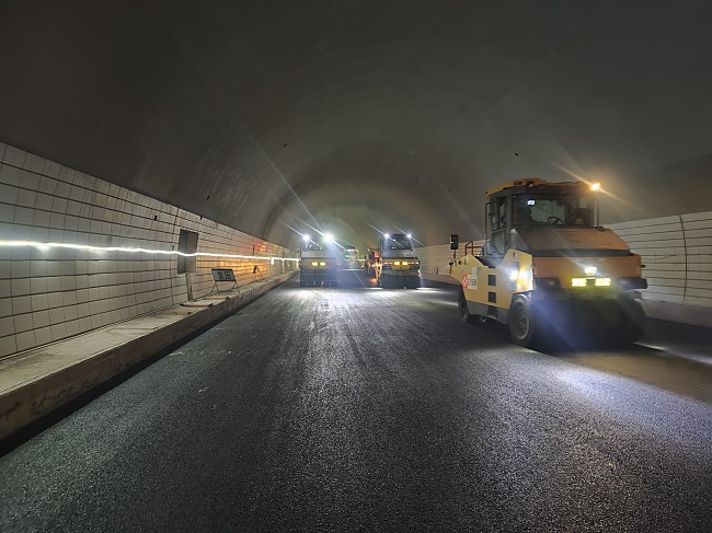 本次攤鋪的瀝青為上面層,位于牛山尖隧道K0+800~K1+400右洞,設計采用AC-13C細粒式SBS改性瀝青混凝土,厚4cm,長600m,寬12.5m,攤鋪面積7500㎡,共計使用瀝青混合料720噸。