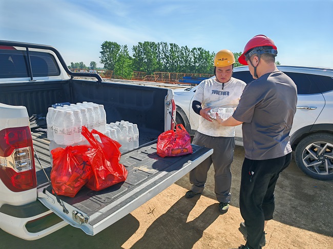 淮桐高速05標項目向土方隊、橋面系、拌合站、防護排水等13個一線施工班組發放包含清涼飲品、綠豆等防暑降溫物資。同時,項目部每日配送解暑酸梅湯、礦泉水等防暑物資至各施工作業點,切實將安全生產與人文關懷落到實處。