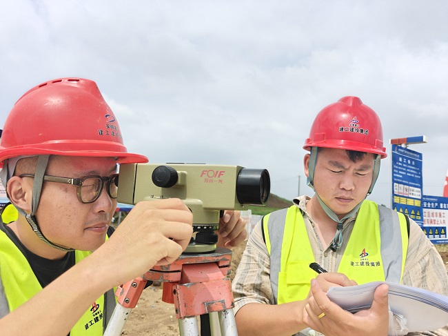 在高溫考驗下,寧九高速項目堅守崗位。測量員在烈日下專注調試儀器,進行四等水準靜態測量,保障工程數據精準,為下一步工作的有序推進做足準備。截止目前,寧九高速項目拌和站建設工作已全面完成,料倉拌料區建設完成100%,拌合樓結構建設100%,辦公區及生活區水電等配套設施已配置齊全。