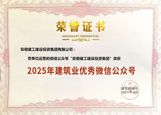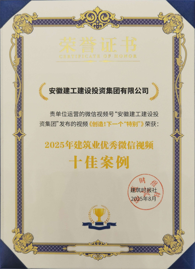 8月7日,由建筑時報主辦的“2025年建筑業微信公眾號運維交流研討會暨2025年建筑業優秀微信公眾號、視頻號發布會”在湖南省長沙市舉辦。公司官方新媒體平臺表現亮眼:微信公眾號連續六年蟬聯“全國建筑業優秀微信公眾號”,視頻號榮獲“2025年建筑業優秀視頻號”稱號,2025年元旦發布的主題視頻《創造!下一個“特別”》更獲評“2025年度建筑業優秀微信視頻十佳案例”獎項,為安徽省唯一獲該獎項的建筑業企業。