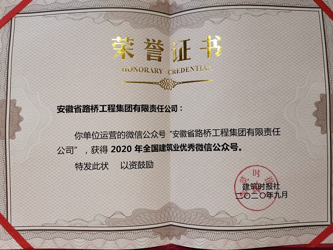 9月24日,由建筑時(shí)報(bào)社主辦的2020年建筑業(yè)微信公眾號(hào)運(yùn)維經(jīng)驗(yàn)交流研討會(huì)暨2020年全國(guó)建筑業(yè)優(yōu)秀微信公眾號(hào)頒獎(jiǎng)典禮在揚(yáng)州召開。公司微信公眾號(hào)“安徽省路橋工程集團(tuán)有限責(zé)任公司”(微信號(hào):ahlqjt)參與申報(bào)并榮獲“全國(guó)建筑業(yè)優(yōu)秀微信公眾號(hào)”稱號(hào)。